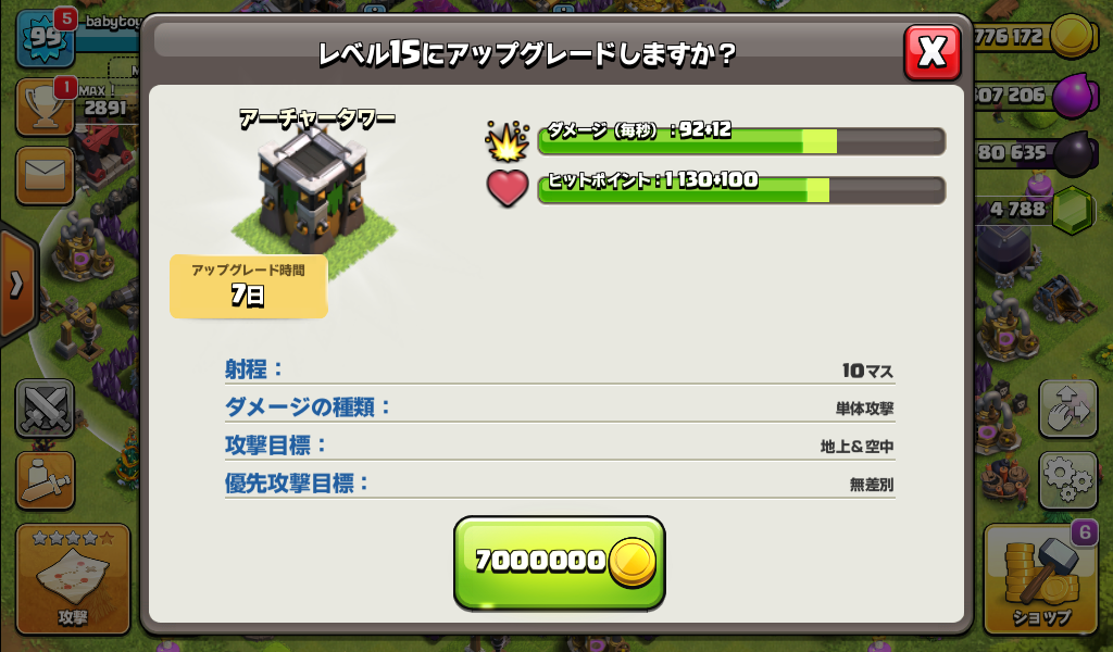 アーチャータワーをレベル15にアップグレードしました。