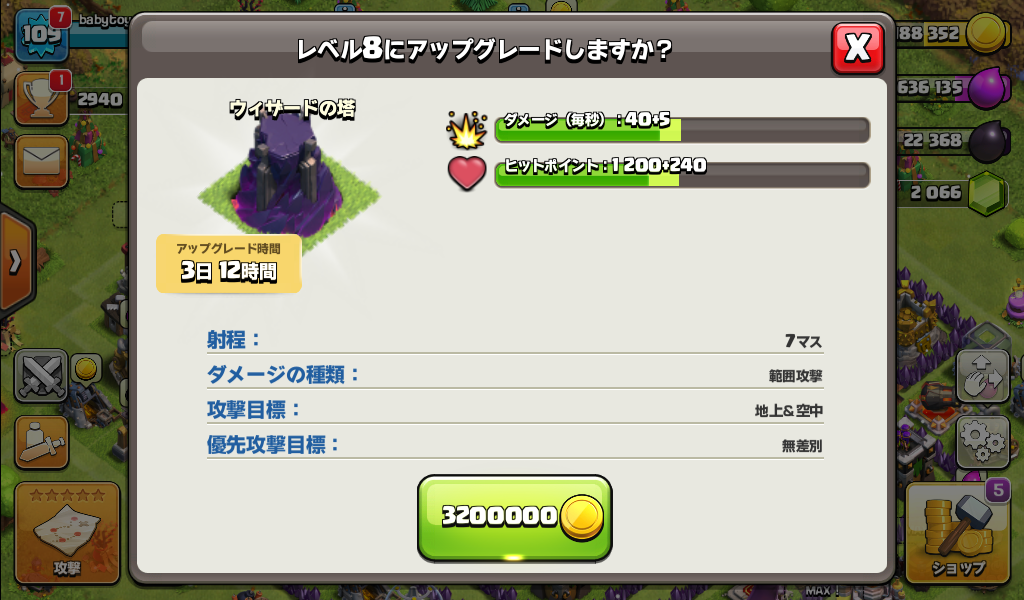 ウィザードの塔をレベル8にアップグレードしました。