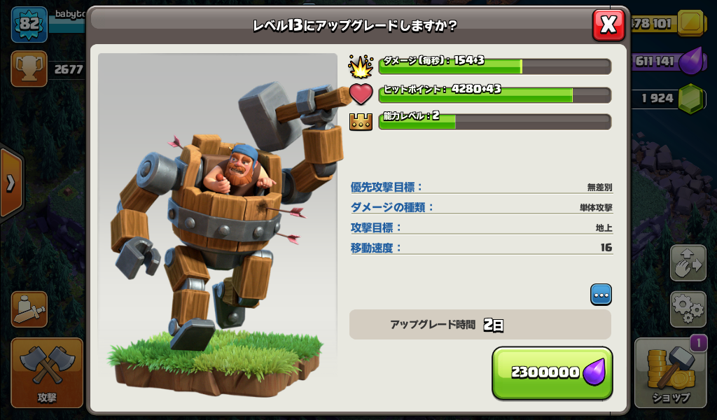 大工の拠点のバトルマシンをレベル13にアップグレードしました。