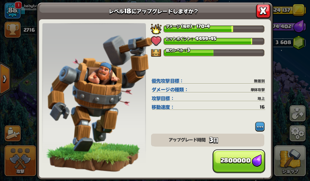 大工の拠点のバトルマシンをレベル18にアップグレードしました。