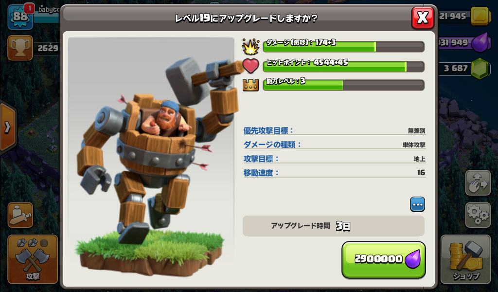 大工の拠点のバトルマシンをレベル19にアップグレードしました。