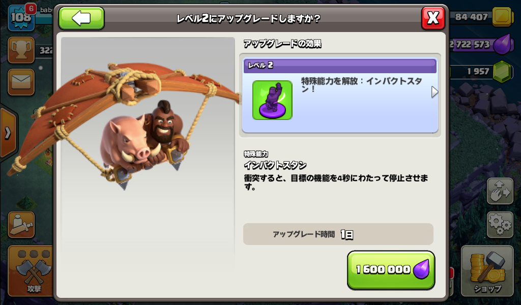 ホググライダーをレベル2にアップグレードしました。