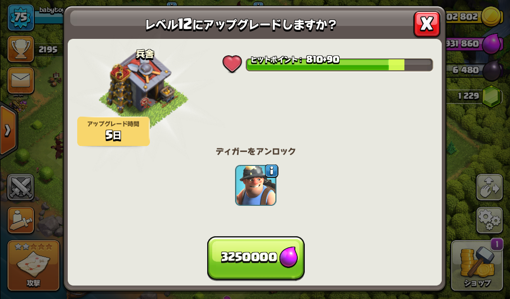 兵舎をレベル12にアップグレードしてディガーをアンロックしました。