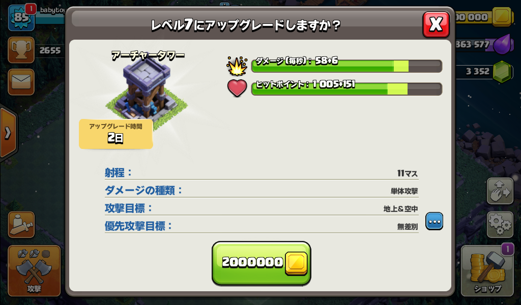 大工の拠点のアーチャータワーをレベル7にアップグレードしました。