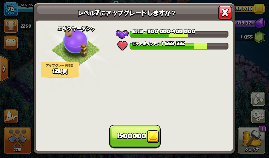 大工の拠点のエリクサータンクをレベル7にアップグレードしました。