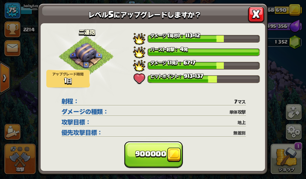 大工の拠点の二連砲をレベル5にアップグレードしました。