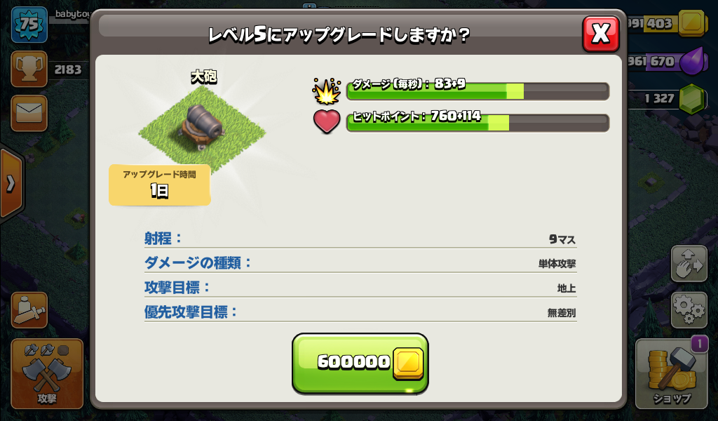 大工の拠点の大砲をレベル5にアップグレードしました。