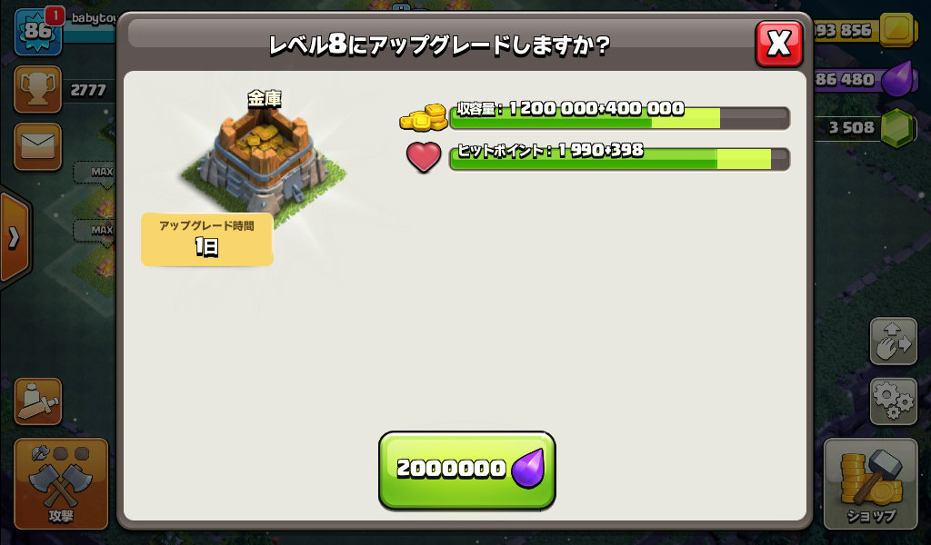 大工の拠点の金庫をレベル8にアップグレードしました。