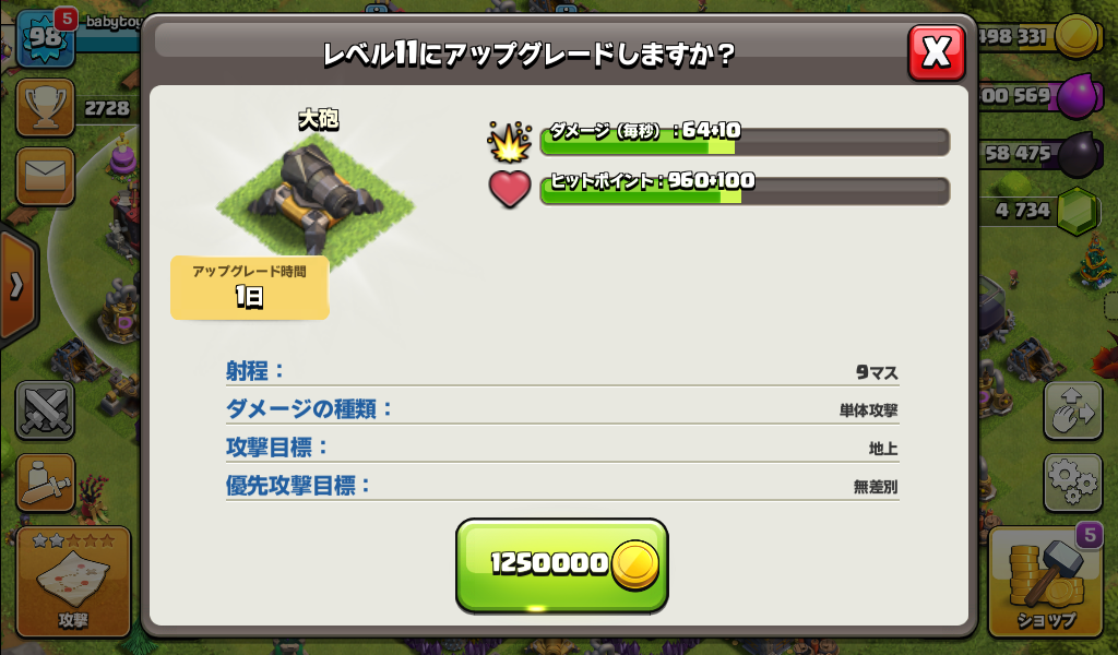 大砲をレベル11にアップグレードしました。