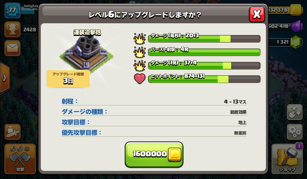 大工の拠点の連装迫撃砲をレベル6にアップグレードしました。