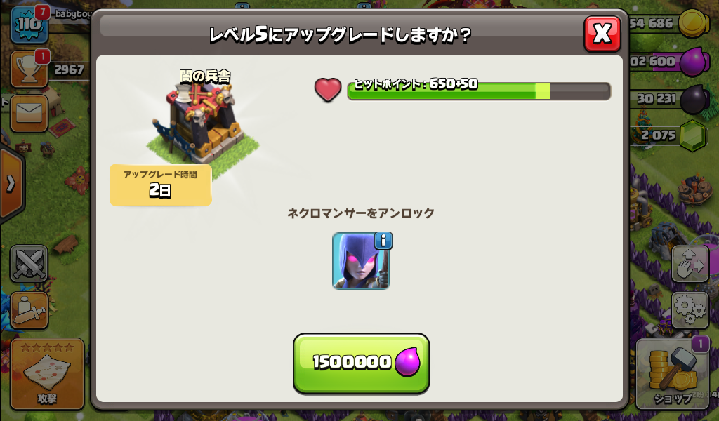 闇の兵舎をレベル5にアップグレードしました。
