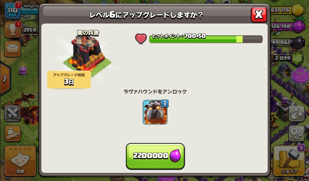 闇の兵舎をレベル6にアップグレードしました。