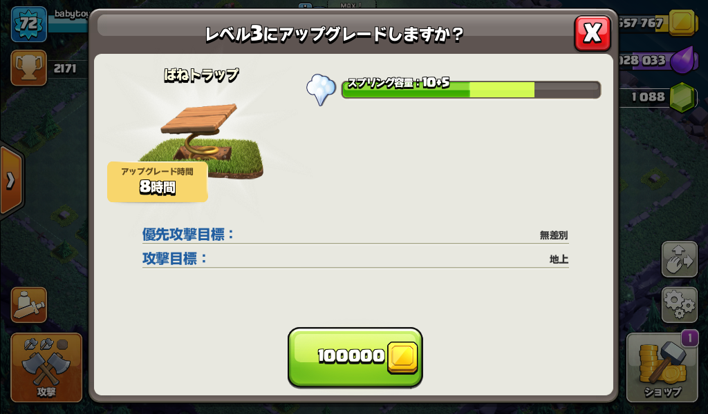 大工の拠点のばねトラップをレベル3にアップグレードしました。